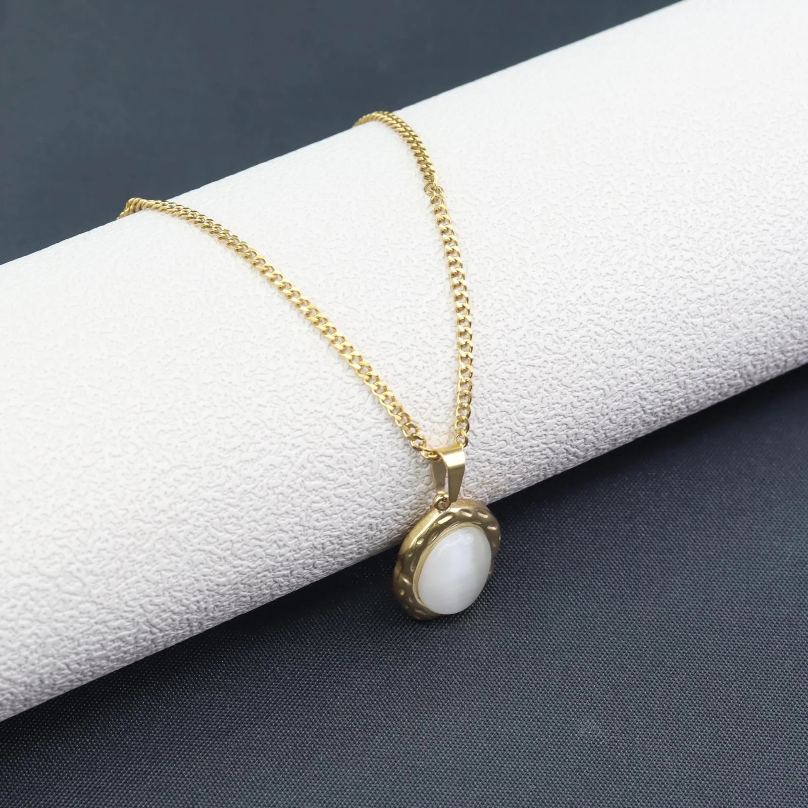 The 18K gold-plated - Opal pendant necklace is a refined expression of elegance, blending natural beauty with timeless design. A smooth white cat-eye opal rests within an oval frame, finished in radiant 18K gold plating. With every movement, the stone reflects a soft, luminous glow, enhancing its graceful charm.